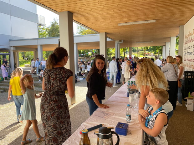 Gleich darauf hatten die Erklässler, die Delfine und Löwen, ihre erste Schulstunde mit ihren Klassenlehrerinnen Fabritius und Käßmann in ihrem Klassenzimmer, während ihre Eltern bereits im Schulhof und Foyer bei bestem Wetter feierten.