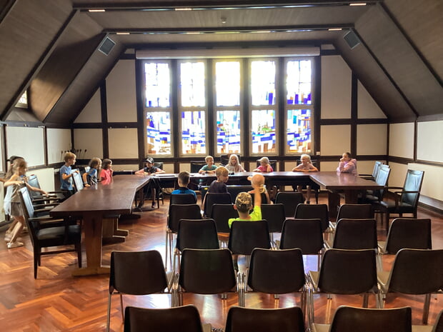 ...Wir durften ins Büro der Bürgermeisterin. Dann sind wir in den Saal, wo die Stadträte tagen. Dort saß dann Charlotte auf dem Platz der Bürgermeisterin und Max saß neben ihr...